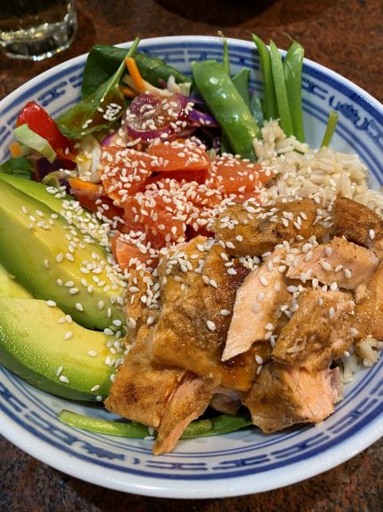 I had rice and salad and some ocean trout in the fridge. This is what I came up with.